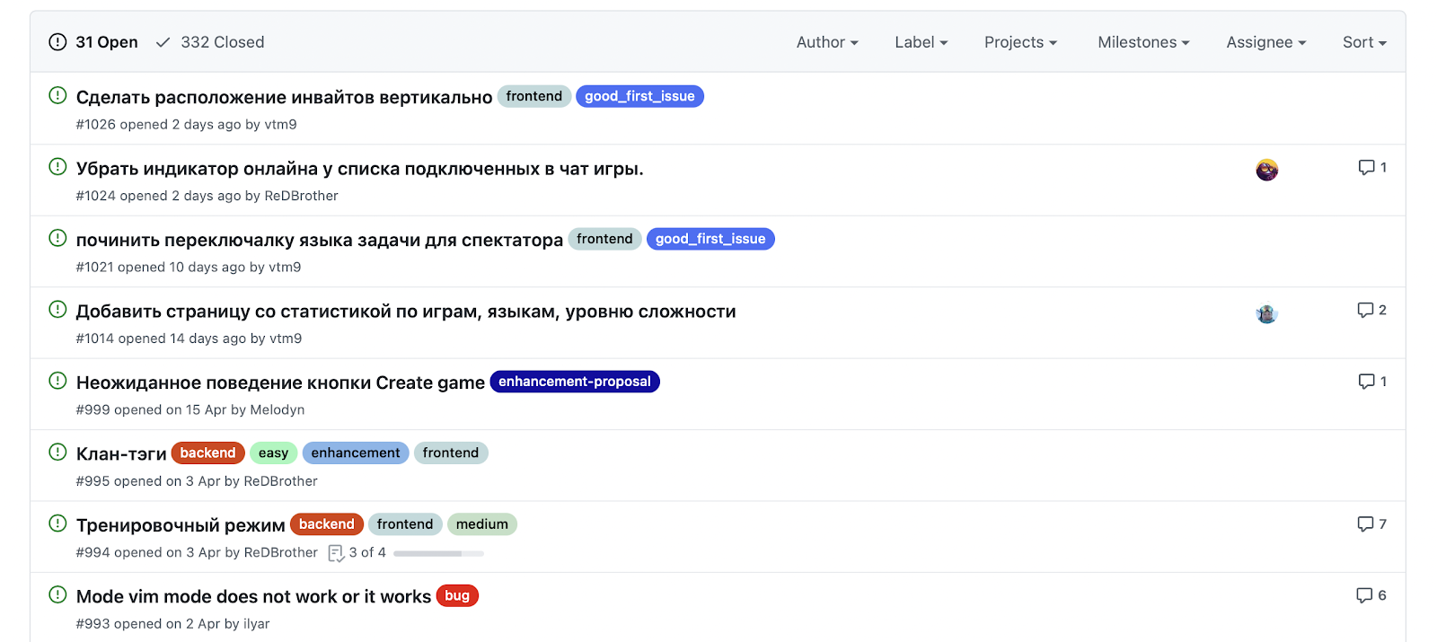 Список актуальных задач находится в репозитории проекта во вкладке Issues. Например, вот «ишью» проекта Codebattle — github.com/hexlet-codebattle/codebattle/issues.
