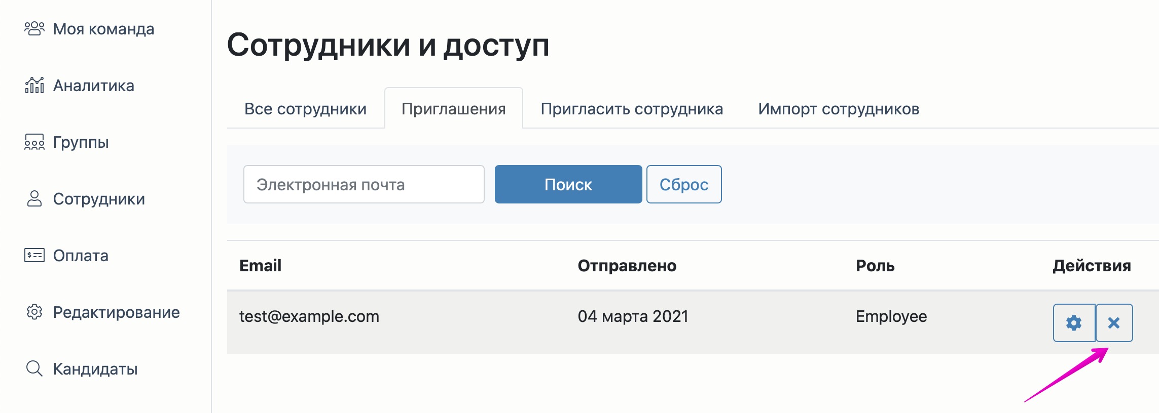 Приглашения можно выслать на несколько адресов и сразу распределить сотрудников по группам. Отправленные и ещё не принятые приглашения отображаются на соответствующей вкладке, там же их можно отменить, нажав на крестик справа.