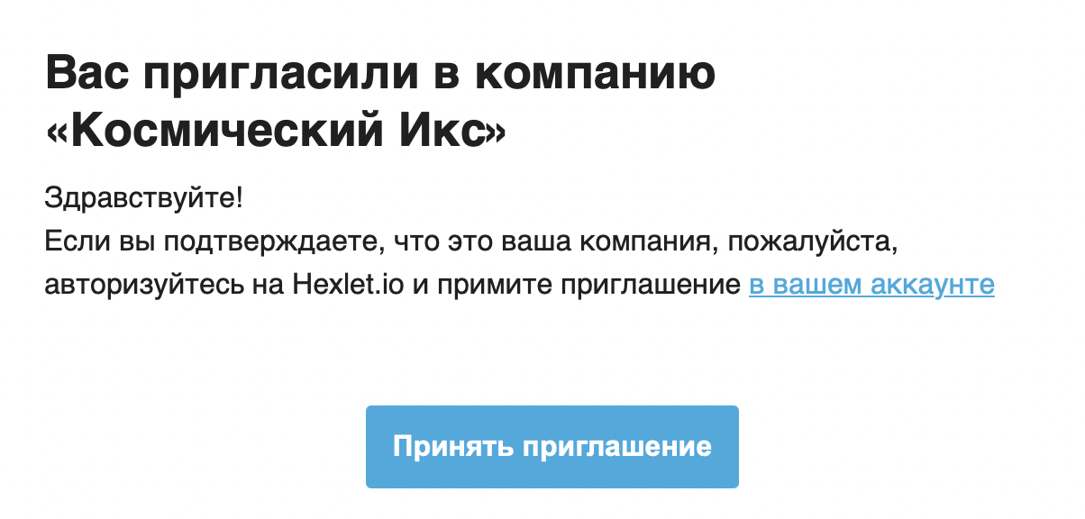 Адрес, на который отправляется приглашение, и адрес, который привязан к аккаунту на Хекслете, могут быть разными. Это полезно, когда нужно отправить приглашения на рабочие емейлы, которые известны HR или руководителю. Получив их, сотрудники смогут вступить в компанию с уже существующими аккаунтами, им не нужно будет регистрироваться в Хекслете заново.