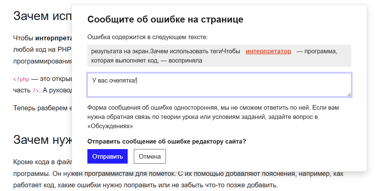 У нас можно сообщать об ошибке/неточности в уроках с помощью Typo Reporter. Вызвать его можно, если выделить нужный текст и прожать Ctrl+Enter (Cmd+Enter на Mac).