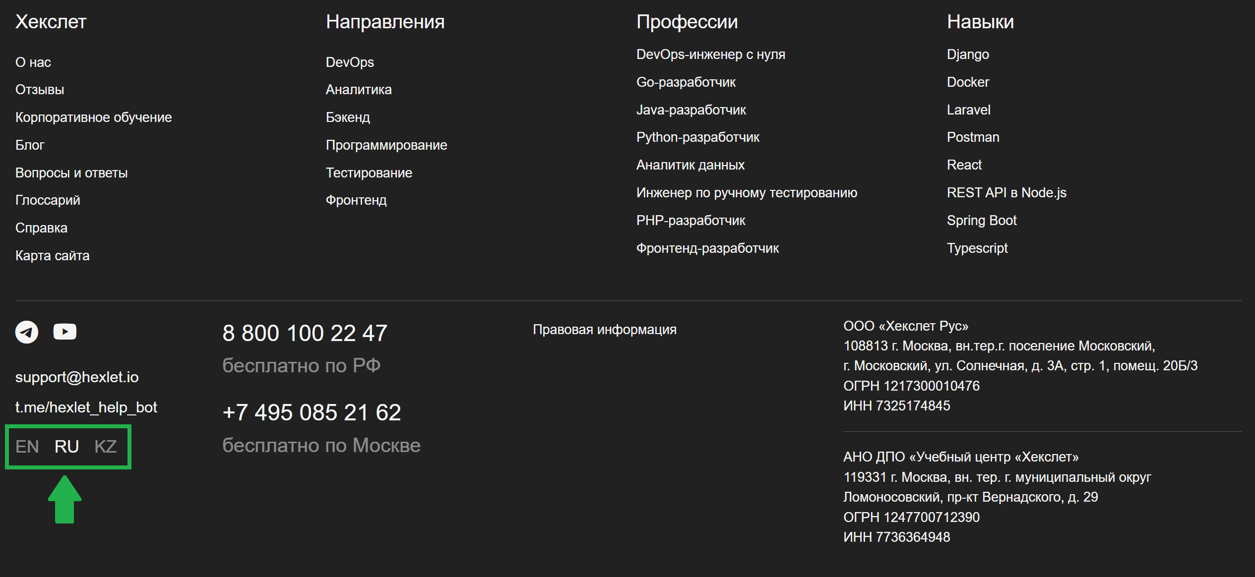 Если вы хотите сменить язык на платформе Хекслет, то сделать это можно в футере.