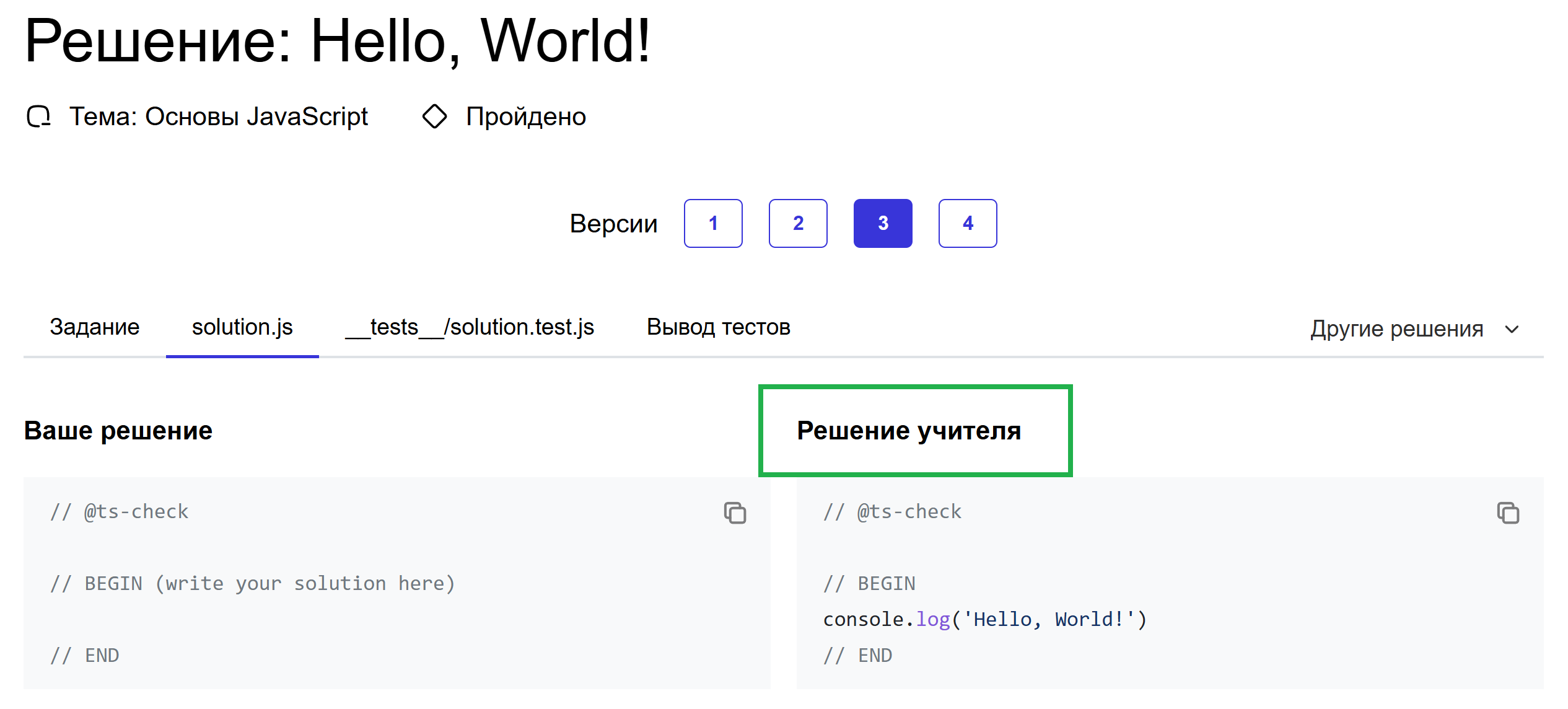 Решение учителя доступно на странице с сохраненным решением в каждом упражнении. Оно предназначено для того, чтобы студент мог подсмотреть готовое решение, если застрял и не может продвинуться дальше.