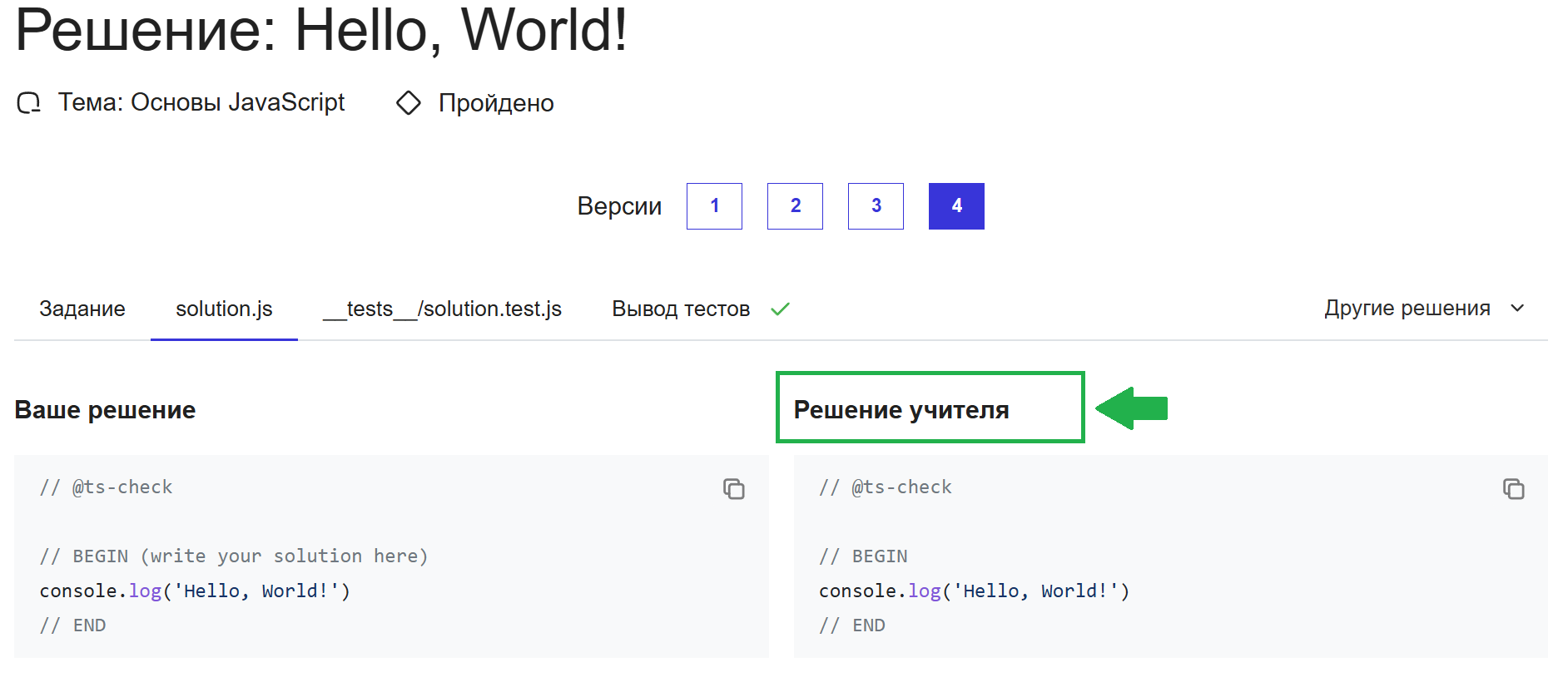 Решение учителя доступно на странице с сохраненным решением в каждом упражнении. Оно предназначено для того, чтобы студент мог подсмотреть готовое решение, если застрял и не может продвинуться дальше.