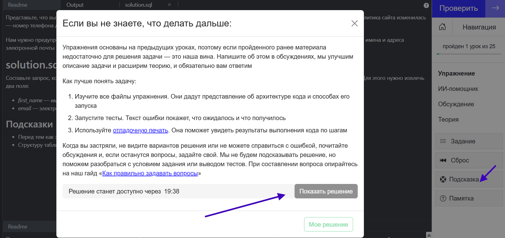 Решение появляется через 20 минут после начала прохождения практики. Это сделано намеренно: мы считаем важным, чтобы сначала студент попробовал найти решение самостоятельно, изучил разные подходы и методы.