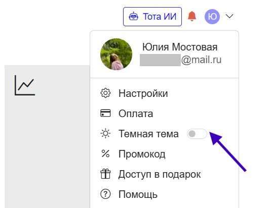 Мы понимаем, что яркий светлый фон может утомлять глаза при долгой работе на платформе или просто визуально не нравиться. Поэтому наша техническая команда добавила возможность переключаться на темную тему.