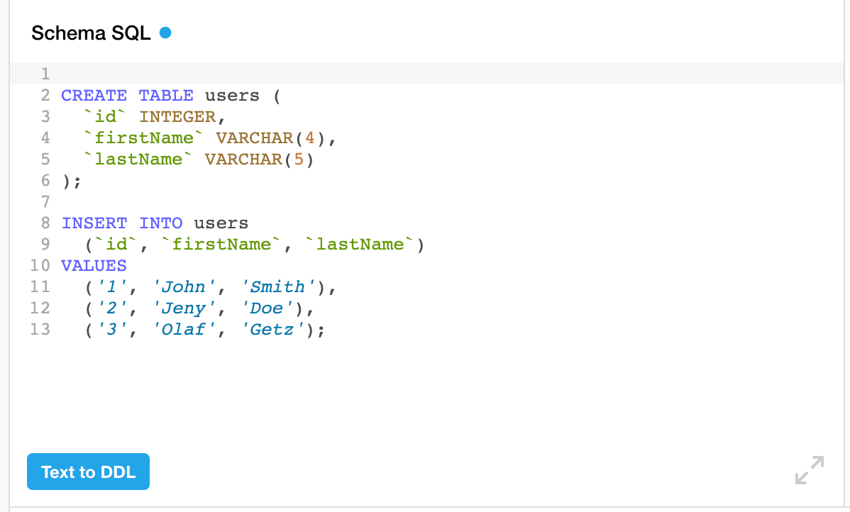 Второй вариант. Если готового скрипта нет, вы можете воспользоваться специальной возможностью — Text to DDL и DB Fiddle поможет преобразовать текст в SQL-скрипт. Нажмите кнопку Text to DDL, далее вы сможете дать вашей таблице имя и наполнить ее данными: