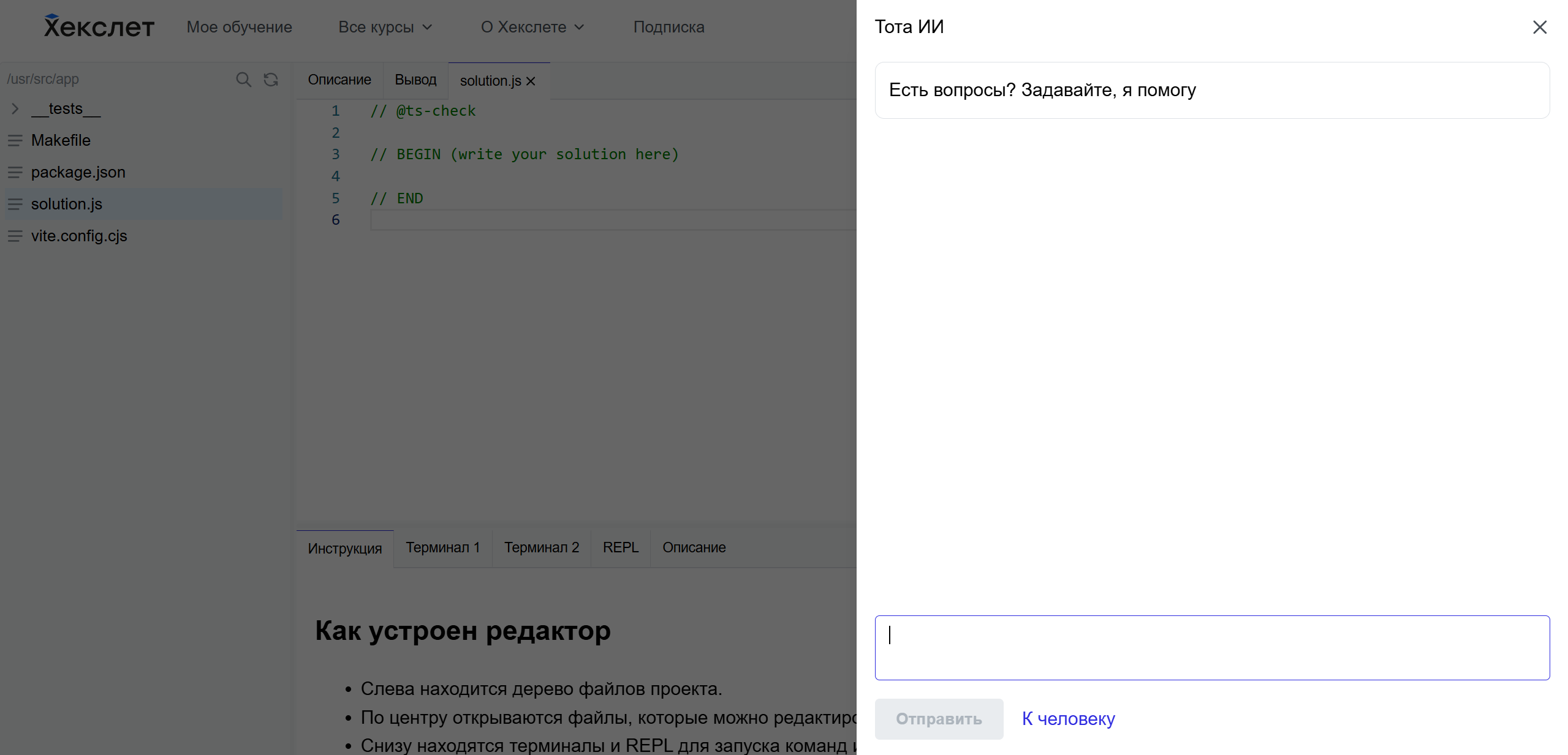 Если при использовании ИИ-помощника возникли проблемы или появились другие вопросы, смело обращайтесь в поддержку Хекслета по почте support@hexlet.io.