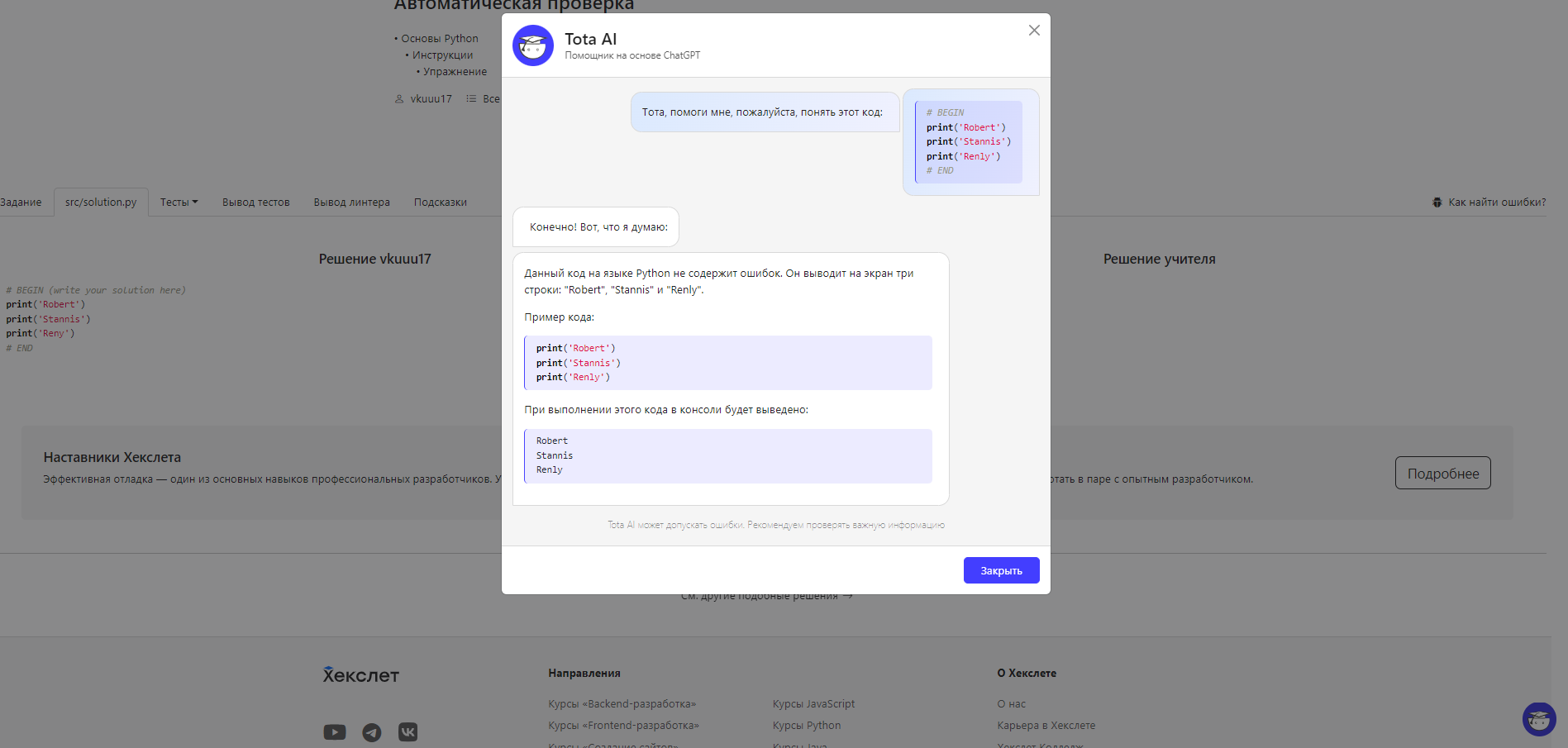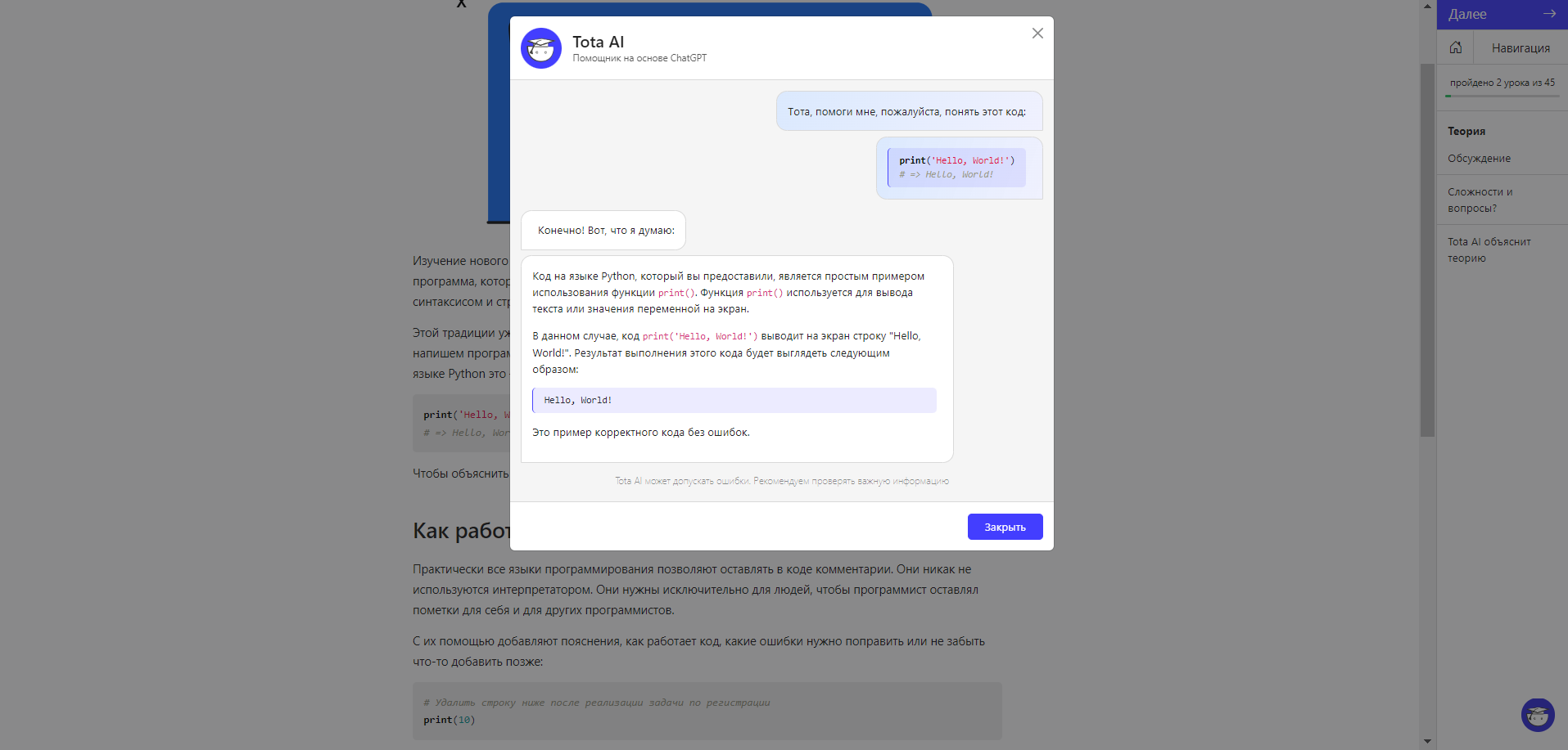 При нажатии на кнопку “Объясни код” появится окно, где Тота подробно распишет все детали.