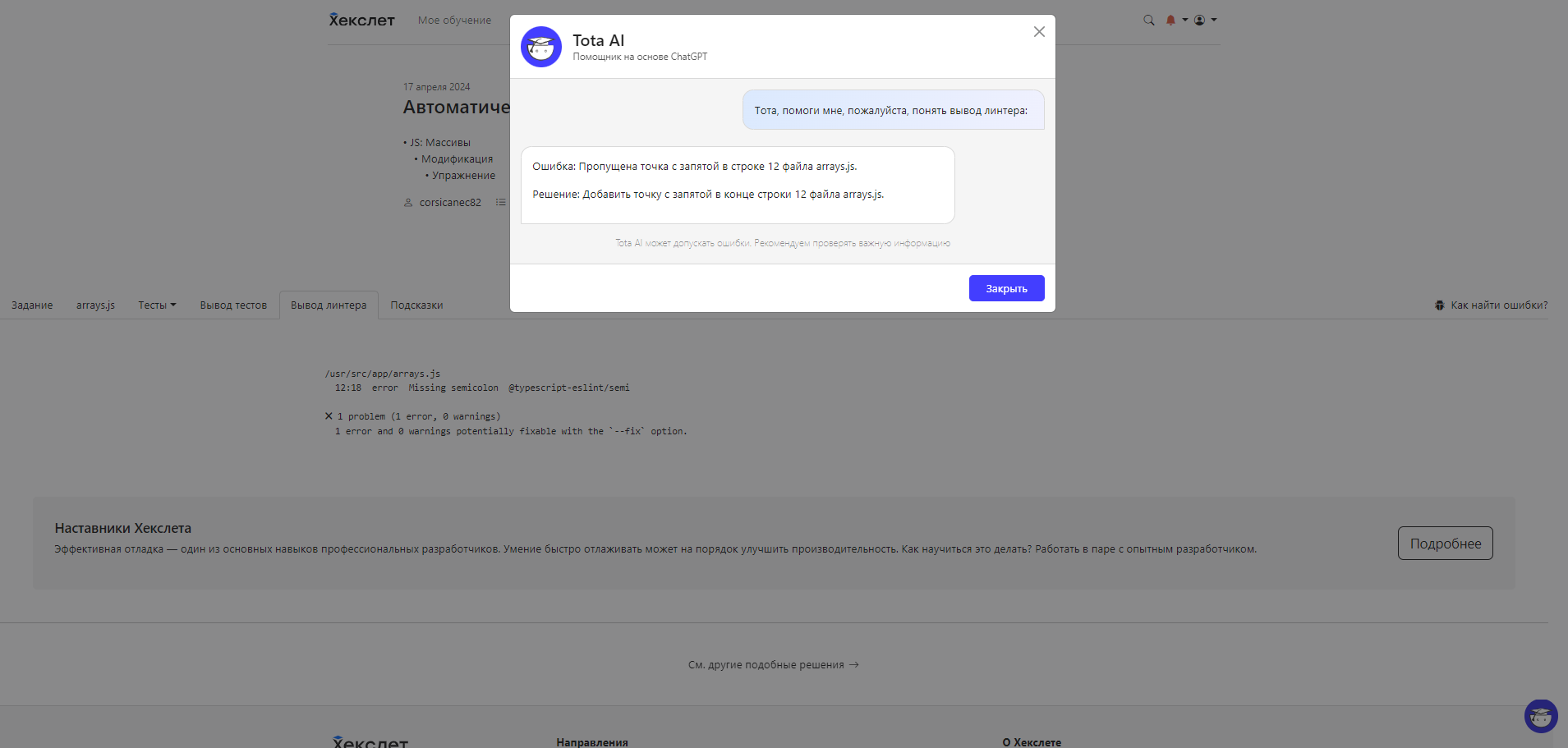 Если в вашем сохраненном решении есть ошибки, то при переходе во вкладку “вывод линтера” и наведении курсора на блок с текстом появится кнопка “Пояснить вывод линтера”. При нажатии на эту кнопку отобразится окно с ответом Тоты.