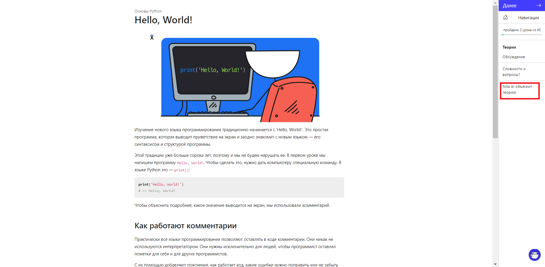 Ещё Тота может объяснить подробно код из примеров в теории уроков. Для этого нужно навести курсор на блок с кодом и появится кнопка “Объясни код”