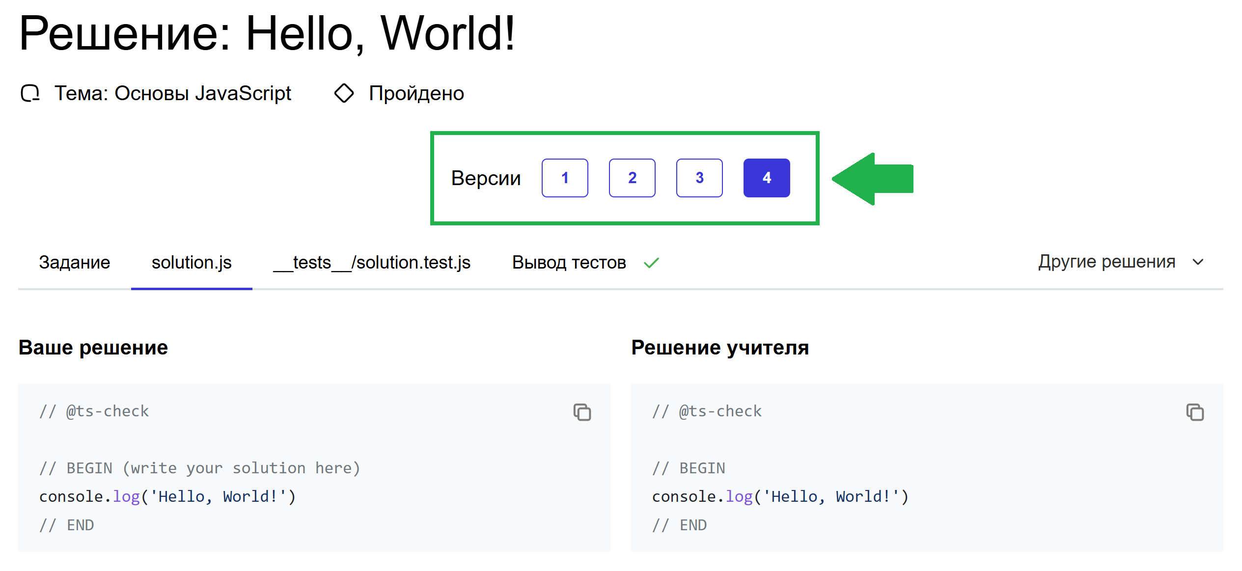 Сохраняйте несколько решений одного упражнения и переключайтесь между ними при помощи кнопок версий посередине страницы.