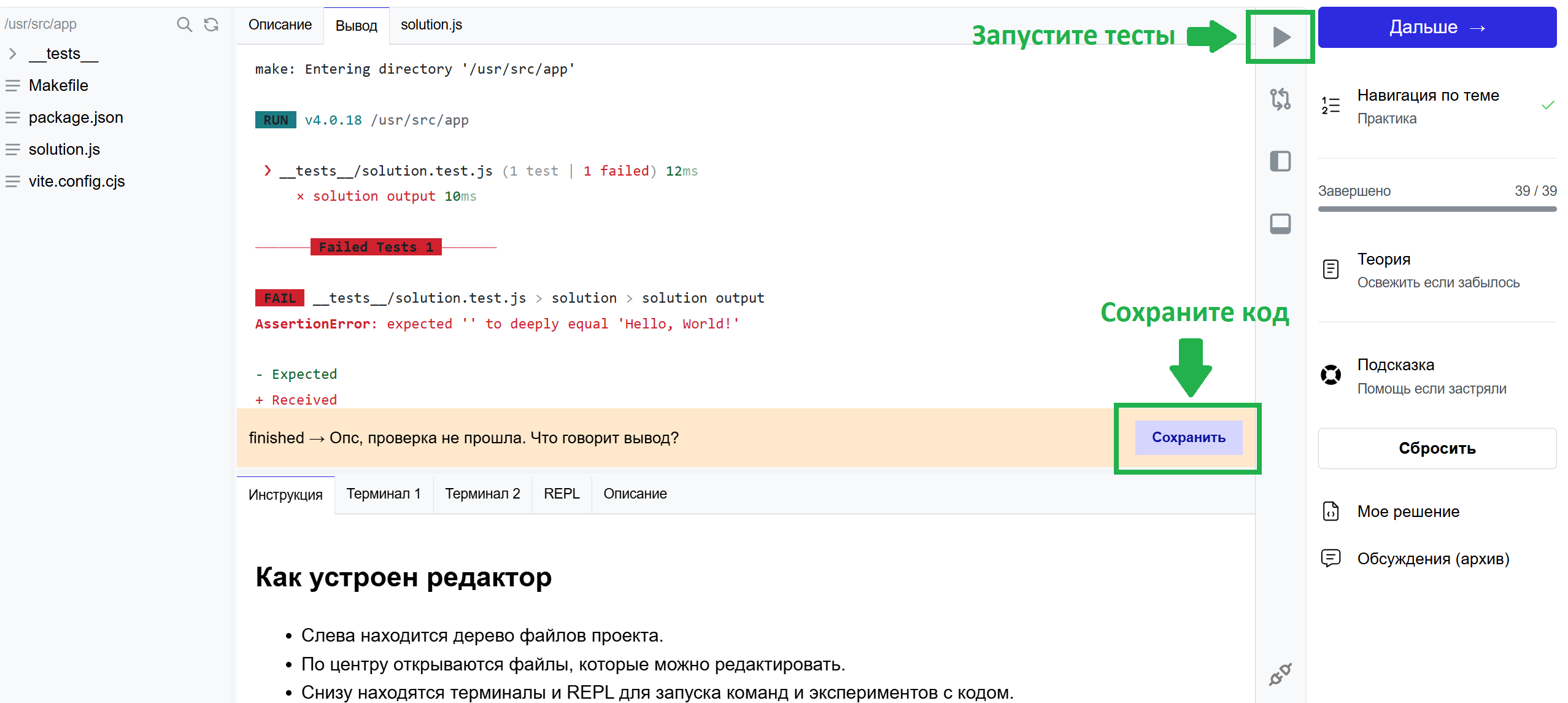 Во время выполнения практики вы можете сохранять свои решения. Это не просто удобная, но и полезная функция. Сохранив решение, вы можете:
