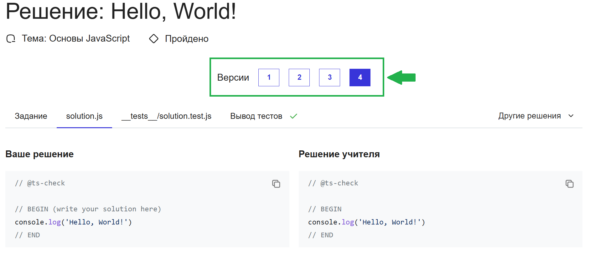 Сохраняйте несколько решений одного упражнения и переключайтесь между ними при помощи кнопок версий посередине страницы.