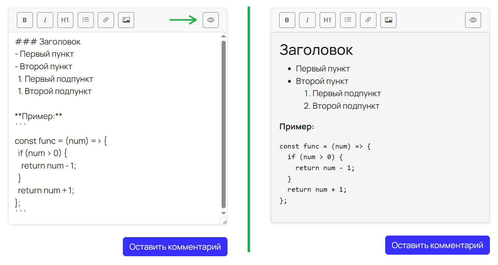 Чтобы проверить, как сообщение будет выглядеть после отправки, можно включить режим просмотра через кнопку с иконкой "глаз":